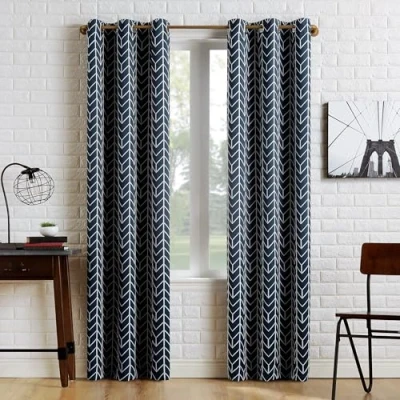 Chevron geometric design adds sophistication to any room of your home Blackout technology blocks out most unwanted light while enhancing privacy Energy Efficient design reduces energy lost through your windows by up to 30% Thermal properties help keep summer heat and winter chill out of your home Silver metal grommet top fits a standard curtain rod up to 1.5" for easy hanging