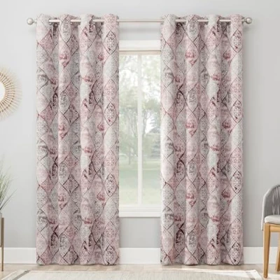Distressed medallion print adds global intrigue Room Darkening technology blocks out some unwanted light while enhancing privacy Energy efficient design reduces energy lost through your windows by up to 20% Thermal properties help keep summer heat and winter chill out of your home Noise reduction up to 25% helps you get a sounder, more uninterrupted sleep Built-in metal grommets fit curtain rods up to 1.5" in diameter