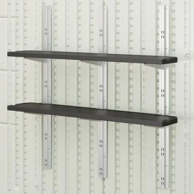 AmazonShelf kit mounts to shed wall Steel reinforcement bar and the screws to mount it Six height positions provide multiple storage configurations Organise outdoor accessories neatly Two resin shelves included