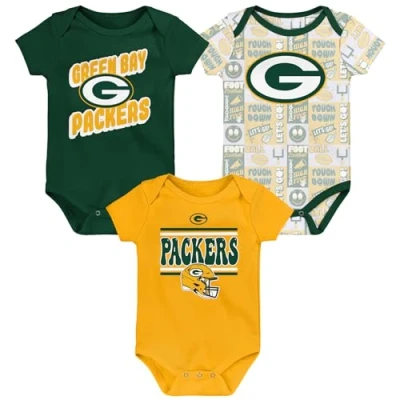Newborn creepers set of three; Short sleeve; Screenprinted team graphics; One creeper features football icon and slogan pattern design; Three button snap closure on the bottom; 100% cotton; Machine wash cold gentle cycle; Imported; Officially licensed NFL product; By Outerstuff