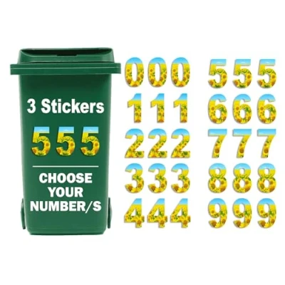 SUNFLOWER 3-PACK – You’ll receive 1 set of 3 Sunflower bin numbers for wheelie bins, designed to help you easily identify your bins and prevent mix-ups with your neighbours CLEAR & VISIBLE DESIGN – Each wheelie bin sticker measures 18cm (7") tall, making your wheelie bin numbers bold, legible, and easy to spot from a distance. HIGH-QUALITY VINYL – These bin stickers for wheelie bins are made from premium, weather-resistant vinyl that stands up to rain, sun, wind, and time. PEEL & APPLY – Our number stickers for wheelie bins are quick and easy to use. Just peel from the backing and stick directly onto your clean bin surface—no fuss, no tools required. DURABLE & LONG-LASTING – Designed to last for years, these bin number stickers, bin stickers, and number stickers stay firmly in place through all weather conditions.