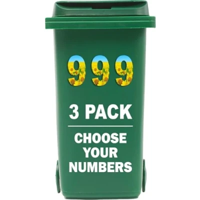 SUNFLOWER 3-PACK – You’ll receive 1 set of 3 Sunflower bin numbers for wheelie bins, designed to help you easily identify your bins and prevent mix-ups with your neighbours CLEAR & VISIBLE DESIGN – Each wheelie bin sticker measures 18cm (7") tall, making your wheelie bin numbers bold, legible, and easy to spot from a distance. HIGH-QUALITY VINYL – These bin stickers for wheelie bins are made from premium, weather-resistant vinyl that stands up to rain, sun, wind, and time. PEEL & APPLY – Our number stickers for wheelie bins are quick and easy to use. Just peel from the backing and stick directly onto your clean bin surface—no fuss, no tools required. DURABLE & LONG-LASTING – Designed to last for years, these bin number stickers, bin stickers, and number stickers stay firmly in place through all weather conditions.