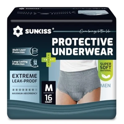 JoybuySUNKISS Incontinence Underwear for Men offers comfortable, skin-friendly, disposable pull-up briefs with maximum absorbency and odor-lock technology, designed for all-day wear with leak protection and a breathable, ergonomic fit. Made from FSC-certified pulp, it is intended for single use and easy disposal.