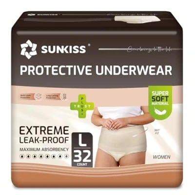 SUNKISS Incontinence Pants Women, Daytime Disposable Postpartum Underwear, Adult Nappies, Protective Pull Ups with Maximum Absorbency, Beige, Large, 32 Count
