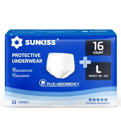Heavy absorbency: Sunkiss disposable incontinence underwear is designed to provide heavy absorbency and worry-free leak protection day and night. The top sheet quickly transfer the fluid and the core locks it to deliver maximum dryness.The material of this product is FSC-certified pulp Anti-leak barrier: Sunkiss incontinence protective underwear are flexible to move with you, interior leg gathers offer additional leakage barrier protection, with anti-leak barriers to guard against leaks, you will stay dry and be comfortable while sitting, standing or lying down. Advanced odor control: A super absorbent core with odor protection quickly wicks away fluid and locks it in the gelled core for overnight dryness. Odor control materials inside the core captures bad odors, delivering comfort and skin wellness. Extra soft: Sunkiss incontinence underwear made with extra soft fabric hugs your curves like regular underwear. Our protective product is natural rubber latex-free, lotion-free and fragrance-free, comfortable to wear and promotes healthy skin. Maximum breathable: Breathable fabric with superior softness provides exceptional fit and increases airflow to deliver maximum comfort.