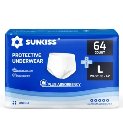 Heavy absorbency: Sunkiss disposable incontinence underwear is designed to provide heavy absorbency and worry-free leak protection day and night. The top sheet quickly transfer the fluid and the core locks it to deliver maximum dryness. Anti-leak barrier: Sunkiss incontinence protective underwear are flexible to move with you, interior leg gathers offer additional leakage barrier protection, with anti-leak barriers to guard against leaks, you will stay dry and be comfortable while sitting, standing or lying down. Advanced odor control: A super absorbent core with odor protection quickly wicks away fluid and locks it in the gelled core for overnight dryness. Odor control materials inside the core captures bad odors, delivering comfort and skin wellness. Extra soft : Sunkiss incontinence underwear made with extra soft fabric hugs your curves like regular underwear. Our protective product is natural rubber latex-free, lotion-free and fragrance-free, comfortable to wear and promotes healthy skin. Maximum breathable: Breathable fabric with superior softness provides exceptional fit and increases airflow to deliver maximum comfort.