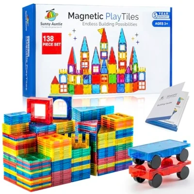 【THE ULTIMATE SET OF MAGNETIC TILES!】The only magnetic tiles set that comes with a full 5-year warranty! This magnetic tile set has everything that kids want. The set includes 138 magnet tiles in various shapes ,and a high-quality fabric carrying case, and a specially-designed Guide Booklet. All designs in the booklet can be built with this one set. The set also includes 2 cars, which kids always love. All pieces are in bright, vivid colors. 【UNIQUE FEATURES OF THIS SET】 Our Magnetic tiles come in a variety of sizes, colors and shapes, allowing kids to be creative and build endless designs. The tiles are well-made, durable and sturdy. They have strong magnets that make them ideal for building large, tall structures. Your kids will love building with these tiles and can play with them for hours each day, for years to come! Compatible with other similarly-sized magnetic tiles brands such as Magna tiles, Picasso magnet tiles, and more. 【PRESCHOOL CREATIVE EDUCATIONAL STEM TOY】 Magnetic Play Tiles is an exceptional toy to promote child development. It helps kids strengthen their creative thinking, imagination, creative problem solving and more, all while having a lot of fun playing with the colorful tiles. It is an excellent toy for parent-child bonding, for playing with other kids, or independent play. Magnetic Play Tiles is a toy that both kids and parents will love as it incorporates plenty of creativity and imagination! 【SAFE PLAY】 Our Magnetic Tiles are made from a high-quality, non-toxic and BPA-free ABS plastic. The magnet tiles’ edges are rounded and safe for kids to handle. The size of the tiles is suitable for small hands and kids can deal with them easily. Our product has passed an ASTM standard lab test and was found suitable for both kids and toddlers. 【GREAT GIFT FOR A BIRTHDAY, HOLIDAY OR ANY OCCASION】 Magnetic Play Tiles are the perfect gift that any kid will love for years to come! They’re bright, colorful, and rewarding to create with. Watch your kid’s self-esteem soar as they successfully build a house, castle, rocket or other models in the booklet, as well as designs from their own creative mind. The possibilities are endless! Great gift for kids aged 3 to 8., Manufacturer: SUNNY AUNTIE