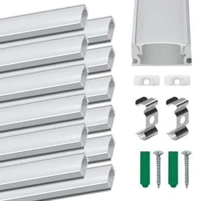 [Spotless Neon Effect]The LED channel system features a frosted LED diffuser cover that spreads light evenly and eliminates harsh glares or visible light dots, creating a smooth neon-like lighting effect. Perfect for enhancing both residential and commercial atmospheres. [Durable Aluminum LED Profile]Made of high-quality anodized aluminum, these LED profiles provide excellent heat dissipation for longer LED strip lifespan. The LED strip light covers also protect strips from dust, moisture, and accidental contact, ensuring safer use. [Cuttable & Easy to Install]Each U-shaped LED aluminum channel can be easily cut to your desired length. Simply stick the LED strip inside, snap on the diffuser, attach the end caps, and mount with the included clips. A flexible solution for any LED strip light project. [Versatile Applications]These LED strip light channels are ideal for under-cabinet lighting, wall or ceiling decorations, furniture accents, wardrobes, staircases, dressing mirrors, and commercial spaces such as offices, galleries, or hotels. Add a modern and elegant light effect anywhere. [Complete Installation Kit】Package includes 12pcs /6pcs 3.3ft LED aluminum channels, 12 /6 frosted covers, 24 / 12 end caps, and 24/12 mounting clips for secure and long-lasting installation. (Note: LED strip lights not included). All-in-one set for hassle-free setup.