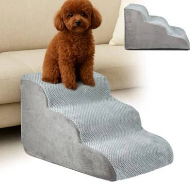 [Small Dog Pet Step] This pet step allows dogs to easily reach higher places, enabling them to climb onto high beds or sofas without owner assistance, reducing the risk of jumping and better protecting their joints. It is ideal for puppies or short-legged dogs, such as Dachshunds and Corgis, as well as senior dogs with mobility issues. Let your pet explore freely and climb safely.Recommendation: After opening the vacuum packaging, tap the product to help it quickly return to its original shape. [High-Density Foam Base] The base of this pet step is made of high-density foam material, which has strong resilience, good support, is not easily deformed or sagged, and is easy to disassemble. The gentle slope design cleverly combines the advantages of steps and ramps, making it easier for dogs to go up and down to higher places, helping to avoid putting extra pressure on their joints. [Easy to Clean] The pet step comes with a removable, machine-washable composite fleece cover for easy cleaning without spending a lot of time. The curved pet step is designed for ultimate comfort, providing your pet with an easy and comfortable climbing experience. The foam pet step can be placed next to the bed, sofa, or other furniture for your pet to climb safely and avoid injury from jumping. [Three-Tier Pet Steps] Our pet steps are primarily designed for puppies weighing no more than 60 pounds (approximately 27 kg), small dogs, dogs with arthritis, senior dogs, and other dogs that have difficulty climbing. The steps measure 56 (L) x 40 (W) x 35 (H) cm; please measure the height your dog needs to climb before purchasing. Made of lightweight sponge material, they are easy to move and blend perfectly with your furniture. [Special Note] The pet steps are vacuum-compressed and require at least 24 hours to fully recover their shape. The step mats are removable via zipper, making assembly and cleaning very convenient.
