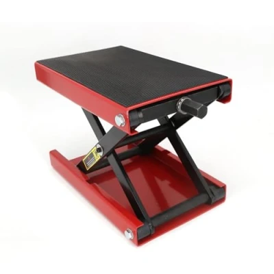 [Applicability] Robust mini lift for safely raising and lowering custom models and other models with double-loop tubular frames. The lower platform and upper platform move together, separated by side cranks. Allows for adjustment to a comfortable and correct height. Suitable for most motorcycles. [Easy Maintenance] Motorcycle articulated jacks are robustly constructed and easy to use, suitable for safe and convenient maintenance and repair work on the front and rear axles in hobby or professional workshops. The surface is oil and dust resistant and easy to clean. [Features] The lift can be individually adjusted using a crank, ratchet, or open-end wrench. The rubber coating prevents scratches and damage to the machine. Hydraulic motorcycle lifts can be individually adjusted using a crank, ratchet, or open-end wrench on the adjustment screw, and the bonded surface prevents scratches and damage to the machine. [Robust and durable] Motorcycle lift for safe and convenient service and repair work on the front and rear axles in hobby or professional workshops. The lift can be mounted on the frame, engine, and swingarm, making it ideal for use in your garage and small outdoor areas. A motorcycle lift is a great helper for daily maintenance of your bike and a must-have in your garage. [Technical specifications] Motorcycle lift: Can be attached to the frame, engine, or swingarm. Recommended for winter storage: Use of tension straps to secure the machine. Support surface 37 x 23 cm, min. height 9.5 cm, max. height 36 cm, dead weight 12.5 kg, max. load capacity 500 kg.