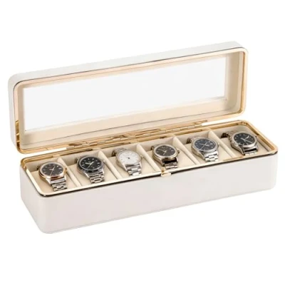 SUNNYNEST Watch Box 6 Slots Case with Glass Lid Display Storage for Men and Women Removable Pillows Metal Clasp Synthetic Leather Velvet Lining (White)