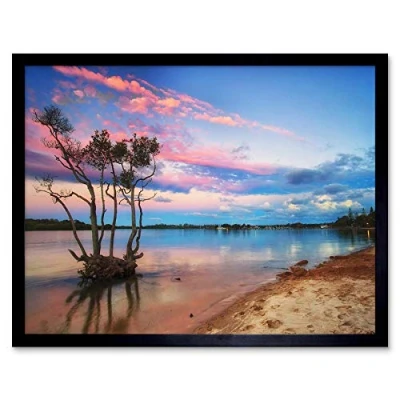 Sunset Mangrove Tree Yamba Lake Pink Blue Beach Art Print Framed Poster Wall Decor 12X16 Inch