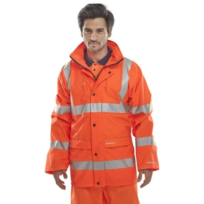 Breathable fabric. Polyester with PU coating. Concealed hood. Full zip front with double storm flap. Self double yoke back. Lower pockets with flap. Elasticated storm cuffs. Stitched and welded seams. Reflective material. EN ISO20471 Class 3 High Visibility EN343 Class 3 Resistance to Water Penetration Class 2 Air Permeability RIS-3279-TOM - Railway use certified.