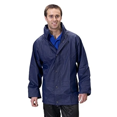 Polyester with PU coating Concealed hood Full zip front with double storm flap Self double yoke back Lower pockets with flap Elasticated wind cuffs Stitched and welded seams