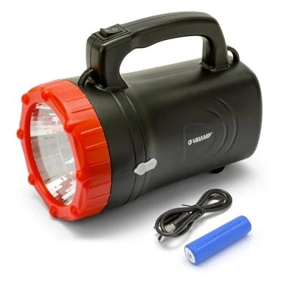 POWERFUL: Rechargeable LED flashlight equipped with a 1W high-power LED. 100 lumens of real power for a beam visible at 150 meters; high-performance Velamp reflector; 30° focused light. RECHARGEABLE: The included 3.7V 800mAh Li-Ion battery provides 3 hours of full-power light. It charges via USB-C port (cable included, charger not included). Replaceable battery. ROBUST: Work light with ultra-resistant ABS construction; large handle, comfortable even with gloves; the ideal companion for industry, professionals, hiking, trekking, and camping. LIGHTWEIGHT: Despite its power, the rechargeable flashlight remains very light and well balanced in the hand, making it very useful when walking the dog, fishing, in the car... VERSATILE. Suitable for all occasions: out walking, in the basement, on construction sites, in the car; IP43 waterproof: suitable for both indoor and outdoor use.