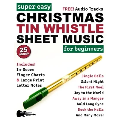 Super Easy Christmas Tin Whistle Sheet Music for Beginners: 25 Popular Carols with Big Letter Notes, In Score Finger Charts + FREE Audio! (Large Print Notes Music)