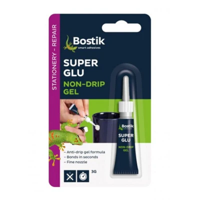 General description Bostik Super Glue Non-Drip Gel is a fast-acting adhesive that creates a strong, durable bond with a variety of materials including wood, ceramics, hard plastics, rubber, metals, and leather. Its non-drip formula is especially suitable for porous and vertical surfaces, ensuring precise application. The gel consistency prevents excess glue from running, making it ideal for detailed or vertical bonding tasks. Technical specifications Type: Gel Size: 3g Bonding materials: Wood, ceramics, plastics, rubber, metals, leather Application: Precise, non-drip Compatibility and accessories Compatible with most common materials used in DIY and home improvement projects Includes a precision nozzle for accurate application Installation Apply a small amount of gel to one surface Press surfaces together firmly Hold for a few seconds until bond forms Usage Suitable for bonding porous and vertical surfaces Use in small amounts to avoid excess glue Allow sufficient curing time for a