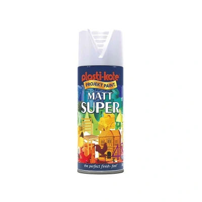 General description The Super Matt Spray White 400ml is a versatile and high-quality multipurpose spray paint designed for various decorative projects both indoors and outdoors. It features a tough, hard-wearing finish that is resistant to scratches and fading, making it ideal for a wide range of applications. Technical specifications Finish: Matt Colour: White Pack Size: 400ml Drying time: Touch dry within 30-50 minutes Recoat within 1 hour Coverage: Approx. 2.23m² per pack Compatibility and accessories This spray paint is suitable for use on various surfaces including: Aluminium Fibreglass Glass Iron Masonry Metal Paper Papier-mâché Plastic Steel Stone Terracotta Wicker Wood Usage Not suitable for use on high impact styrene, leather, Styrofoam, and vinyl. The paint is designed for a variety of decorative projects, providing a durable and attractive finish.