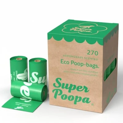 ** Ultra-Durable & leakproof ** Designed for large dogs and heavy duty use, these extra strong dog poop bags are 100% leak-proof and tear-resistant. Our long dog waste bags keep your hands clean and odor-free on every walk. ** Eco friendly & sustainable ** Make a positive impact with our eco-friendly dog poo bags made from 65% certified post-consumer recycled plastic. These planet-friendly dog bags give a second life to thousands of kgs of landfill-bound plastic annually, reducing your carbon pawprint. ** Making a difference ** Beyond being biodegradable dog waste bags, Super Poopa is on a mission to improve dog welfare and clean our oceans. Choose a brand committed to a greener planet for pets and people. ** Bulk pack & perfect size ** This convenient bulk pack includes 270 lemongrass scented poop bags across 18 easy-to-load refill rolls. Each lemongrass scented doggy bag measures a generous 22 cm x 33 cm, ideal for all dog sizes and ensuring mess-free cleanup. ** Low Roll Warning ** A subtle reminder appears four bags from the end, so you’re never caught without a roll when you need it most!