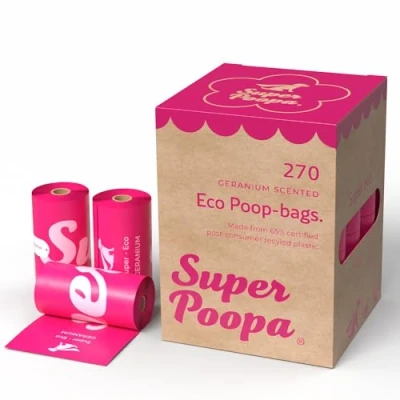 ** Ultra-Durable & leakproof ** Designed for large dogs and heavy duty use, these extra strong dog poo bags are 100% leak-proof and tear-resistant. Our long dog waste bags keep your hands clean and odor-free on every walk. ** Eco friendly & sustainable ** Make a positive impact with our eco-friendly dog waste bags made from 65% certified post-consumer recycled plastic. These planet-friendly dog bags give a second life to thousands of kgs of landfill-bound plastic annually, reducing your carbon pawprint. ** Making a difference ** Beyond being biodegradable dog poo bags, Super Poopa is on a mission to improve dog welfare and clean our oceans. Choose a brand committed to a greener planet for pets and people. ** Bulk pack & perfect size ** This convenient bulk pack includes 270 fragrance-free dog poop bags across 18 easy-to-load refill rolls. Each geranium scented doggy bag measures a generous 22 cm x 33 cm, ideal for all dog sizes and ensuring mess-free cleanup. ** Low Roll Warning ** A subtle reminder appears four bags from the end, so you’re never caught without a roll when you need it most!