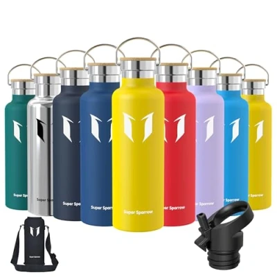INSULATED STAINLESS STEEL WATER BOTTLE- No longer relying on cheap plastic water bottles that split and crack, our 18/8 stainless steel water bottle is manufactured from durable materials, for a bottle that can withstand your tough workouts! It can keep hot liquid warm for up to hours, and keep cold drinks chilled for up to 12 hours also ensures no sweating or condensation. Perfectly suited for Running, Gym, Yoga, office, Outdoors, and Camping. 2 INTERCHANGEABLE CAPS - (1) Sport Cap effortlessly delivers a high flow rate that makes it easy to drink from your bottle without removing the lid (2) Bamboo Cap enables you to carry it with ease or attach it to a backpack, for that it is convenient to take it with you on hikes, trekking, camping, or to the gym! BPA-FREE MATERIAL - The cheaper plastic water bottles leech chemicals and alter the taste of your drink when refilled. The Super Sparrow stainless steel water bottle is manufactured using premium 18/8 stainless steel BPA-free, so you don't have to worry about it being safe. PREMIUM QUALITY DESIGN AND FUNCTIONALITY - We designed the Super Sparrow water bottle to look and function differently from other Stainless Steel Water Bottles! It is ergonomically shaped to make one-handed use a breeze, perfect for hardwearing use. It is both stylish and convenient to use, and each bottle comes in a gift box for a great present! CUSTOMER AND PRODUCT SATISFACTION: Customers stand behind Super Sparrow products and have great faith in our products. Super Sparrow is committed to high standards of durable and robust materials. Super Sparrow products have a lifetime warranty against manufacturing defects