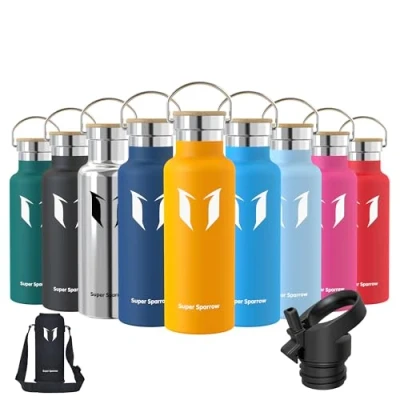 INSULATED STAINLESS STEEL WATER BOTTLE- No longer relying on cheap plastic water bottles that split and crack, our 18/8 stainless steel water bottle is manufactured from durable materials, for a bottle that can withstand your tough workouts! It can keep hot liquid warm for up to hours, and keep cold drinks chilled for up to 12 hours also ensures no sweating or condensation. Perfectly suited for Running, Gym, Yoga, office, Outdoors, and Camping. 2 INTERCHANGEABLE CAPS - (1) Sport Cap effortlessly delivers a high flow rate that makes it easy to drink from your bottle without removing the lid (2) Bamboo Cap enables you to carry it with ease or attach it to a backpack, for that it is convenient to take it with you on hikes, trekking, camping, or to the gym! BPA-FREE MATERIAL - The cheaper plastic water bottles leech chemicals and alter the taste of your drink when refilled. The Super Sparrow stainless steel water bottle is manufactured using premium 18/8 stainless steel BPA-free, so you don't have to worry about it being safe. PREMIUM QUALITY DESIGN AND FUNCTIONALITY - We designed the Super Sparrow water bottle to look and function differently from other Stainless Steel Water Bottles! It is ergonomically shaped to make one-handed use a breeze, perfect for hardwearing use. It is both stylish and convenient to use, and each bottle comes in a gift box for a great present! CUSTOMER AND PRODUCT SATISFACTION: Customers stand behind Super Sparrow products and have great faith in our products. Super Sparrow is committed to high standards of durable and robust materials. Super Sparrow products have a lifetime warranty against manufacturing defects