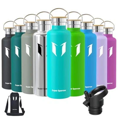 INSULATED STAINLESS STEEL WATER BOTTLE- No longer relying on cheap plastic water bottles that split and crack, our 18/8 stainless steel water bottle is manufactured from durable materials, for a bottle that can withstand your tough workouts! It can keep hot liquid warm for up to hours, and keep cold drinks chilled for up to 12 hours also ensures no sweating or condensation. Perfectly suited for Running, Gym, Yoga, office, Outdoors, and Camping. 2 INTERCHANGEABLE CAPS - (1) Sport Cap effortlessly delivers a high flow rate that makes it easy to drink from your bottle without removing the lid (2) Bamboo Cap enables you to carry it with ease or attach it to a backpack, for that it is convenient to take it with you on hikes, trekking, camping, or to the gym! BPA-FREE MATERIAL - The cheaper plastic water bottles leech chemicals and alter the taste of your drink when refilled. The Super Sparrow stainless steel water bottle is manufactured using premium 18/8 stainless steel BPA-free, so you don't have to worry about it being safe. PREMIUM QUALITY DESIGN AND FUNCTIONALITY - We designed the Super Sparrow water bottle to look and function differently from other Stainless Steel Water Bottles! It is ergonomically shaped to make one-handed use a breeze, perfect for hardwearing use. Customer-Oriented: We believe that the Super Sparrow stainless steel bottle stands out in the market for its quality and performance. We offer comprehensive after-sales support for all Super Sparrow products to ensure satisfaction and resolve any manufacturing defects.