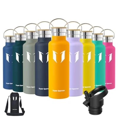 INSULATED STAINLESS STEEL WATER BOTTLE- No longer relying on cheap plastic water bottles that split and crack, our 18/8 stainless steel water bottle is manufactured from durable materials, for a bottle that can withstand your tough workouts! It can keep hot liquid warm for up to hours, and keep cold drinks chilled for up to 12 hours also ensures no sweating or condensation. Perfectly suited for Running, Gym, Yoga, office, Outdoors, and Camping. 2 INTERCHANGEABLE CAPS - (1) Sport Cap effortlessly delivers a high flow rate that makes it easy to drink from your bottle without removing the lid (2) Bamboo Cap enables you to carry it with ease or attach it to a backpack, for that it is convenient to take it with you on hikes, trekking, camping, or to the gym! BPA-FREE MATERIAL - The cheaper plastic water bottles leech chemicals and alter the taste of your drink when refilled. The Super Sparrow stainless steel water bottle is manufactured using premium 18/8 stainless steel BPA-free, so you don't have to worry about it being safe. PREMIUM QUALITY DESIGN AND FUNCTIONALITY - We designed the Super Sparrow water bottle to look and function differently from other Stainless Steel Water Bottles! It is ergonomically shaped to make one-handed use a breeze, perfect for hardwearing use. It is both stylish and convenient to use, and each bottle comes in a gift box for a great present! CUSTOMER AND PRODUCT SATISFACTION: Customers stand behind Super Sparrow products and have great faith in our products. Super Sparrow is committed to high standards of durable and robust materials. Super Sparrow products have a lifetime warranty against manufacturing defects