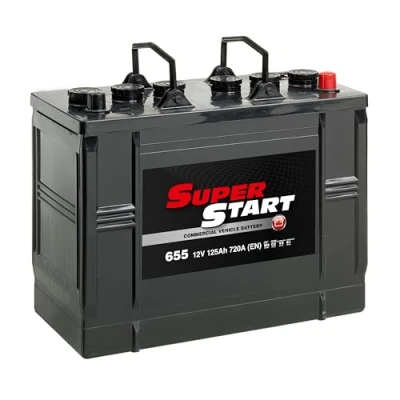SPECIFICATION: 12V Replacement Battery; Capacity: 125Ah; Startup Power (CCA): 720A; Size (mm): 347 x 174 x 285 Weight: 34 kg SUPPLIED CHARGED & READY TO FIT: This Super Start 655 Battery utilises next generation battery technology developed with leading vehicle manufacturers MAINTENANCE FREE: Enjoy a hassle-free experience with this maintenance-free battery, which eliminates the need for regular topping-up VIBRATION AND SHOCK RESISTANT: Built to withstand vibrations and shocks to ensure durable and reliable operation in various driving conditions, making it ideal for demanding applications. ENHANCED SAFETY FEATURES: This Super Start 655 battery includes integrated flame arrestor & built in carrying handles for ease of use