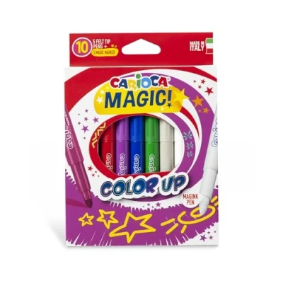 Box of 10 CARIOCA Color Up markers: magic ink markers for coloring over other colors with a maxi 6mm tip. Includes 5 Magink markers The 5 Magink markers included in the pack allow you to color over other colors thanks to their magical ink! Made in Italy Warnings: Not suitable for children under 3 years old; small detachable parts; choking hazard. CARIOCA products are made with the utmost care, quality, and safety For over 50 years CARIOCA has been a symbol of the best Made in Italy with products designed to develop children's creativity: markers, colored pencils, tempera, crayons, educational games and more The inks of CARIOCA markers are produced entirely in the Settimo Torinese factories with food-grade dyes and ensure unbeatable levels of washability and brilliance.