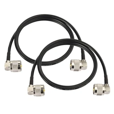 Cable Type: RG58; Connector: PL259 Male Right Angle; Impedance: 50ohm; Length: 90cm/3ft; Package List: 2pcs cables Robust Structure: Nickel-plated brass material (corrosion resistance). The large-diameter center pin ensures optimal electrical connectivity. Threaded connection with the device connector enables ultra-stable mechanical engagement Superior Shielding & Signal Integrity: Its Tinned Copper conductor supports better signal retention for longer cable runs and higher frequency use. The Tinned Copper Braid shield maximizes long-distance signal protection, with shielding performance exceeding 95% and resistance to EMI and RFI up to 95% Outdoor Available: Encased in a wear-resistant PVC jacket with excellent weather resistance, which can withstand wind, rain, sand and humid environments, making it suitable for both indoor and outdoor use. The joints are reinforced with heat-shrinkable tubes for tensile resistance and anti-loosening performance Wide Compatibility: Suitable for various HF/VHF equipment (high-frequency). It is commonly used in Antenna, Duplexer, CB Radio, Ham Radio, Amateur Radio, Power/SWR Meter, HF Radio, VHF Radio, Surge Protector, Walkie Talkies, Antenna Analyzer, Antenna Tuner, Dummy Load, Radio Scanner and more
