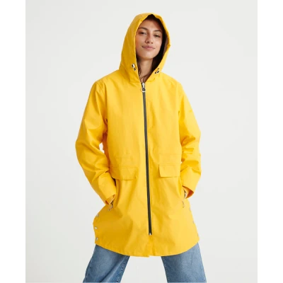 Superdry women's Hydrotech mac jacket. This waterproof jacket features a coated zip fastening, bungee cord adjustable hood, a drawstring adjustable waist, two front pockets with coated zips, a part mesh lining, popper fastened side seams for comfortable sitting, a jersey lining in the hood, ventilation at the back and under the arms, and ribbed cuffs. Finished with a subtle printed Superdry logo on one arm.