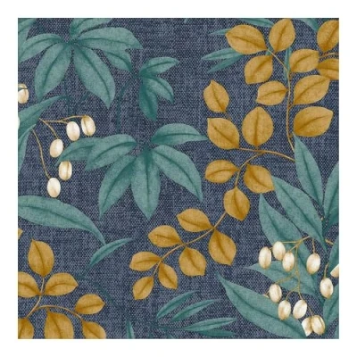 WallpaperDirectA pretty leaf and berry trailing design overlaid on a faux fabric look background. Shown here in the Navy / Ochre colourway.