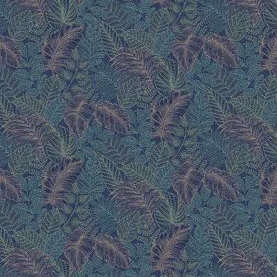 A contemporary montage of overlapping leaves. Textured skelton outlines overlapping in different patterns and shades of colour with metallic detailing. Shown in the rich blue / copper colourway.
