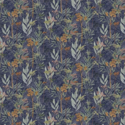 An elegant design of leaves and berries in an all over pattern with a light texture and metallic detail. Shown here in the navy / copper colourway.
