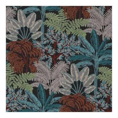 WallpaperDirectA lightly textured fabric look wallcovering with an all over jungle pattern of leaves and trees. Shown here in the Twilight colourway of shades of blue, green, stone and terracotta on a dark blue background.Search: palm tree, travellers palm, fan
