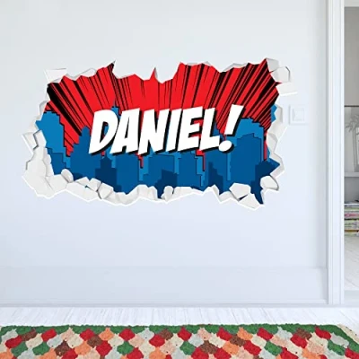 Superhero Wall Sticker Personalised Name Cityscape Broken Decal (120cm Width x 65cm Height)