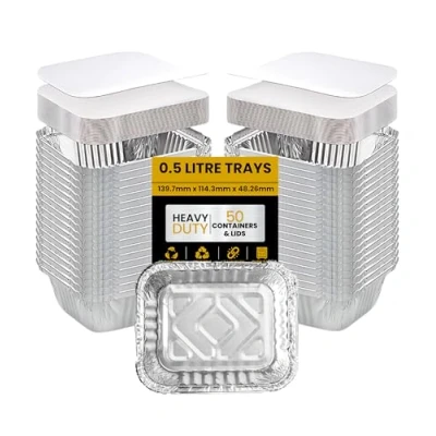 Superior Pack of 50 Aluminium Foil containers with Lids 0.5L Meal Prep Food Trays, Trays for Baking, Roasting, Takeaway & Storage Oven Safe, Leak Resistant