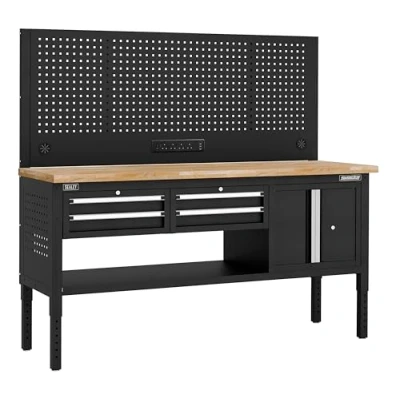 HEIGHT ADJUSTABLE - Bench can be set up at a height to suit the user between 760-1064mm. STORAGE - Four lockable drawers with ball-bearing drawer slides and lockable cupboard. ADJUSTABLE FEET - Fitted with four adjustable feet to level on uneven ground. WORKSHOP READY - Frame manufactured from heavy gauge powder coated steel. WORKTOP - Durable 38mm thick wooden worktop.
