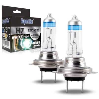 Model White Pro E-mark. Pack of 2 light bulbs. Light bulbs H7. 12 V 55 W. 4000 K. + 130% more light on the road. Halogen Light Bulbs. Suitable for multiple types of vehicles, headlights and fog. 37R E4 Certified.