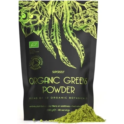 CURATED DAILY SUPERFOOD BOOST - This SuperSelf Organic Greens Powder combines 12 of the most-researched and best-loved superfoods into one convenient super greens blend. An ideal addition to your individual journey, this superfood powder supports wellness without compromising on taste, quality or convenience. EXCLUSIVE SUPERFOOD BLEND - Every organic ingredient in this powder has been carefully selected to work together in natural harmony; no fillers, colourings, or additives allowed. High in protein, fibre, vitamins and minerals - this super greens powder contains only wheatgrass, chlorella, spirulina, acai berry, matcha green tea, maca root, flaxseeds, baobab, barley grass, kale, kelp, and guarana. QUICK, EASY AND PLEASANT - Make your health a priority by centring it in a simple daily ritual. Mix 1 teaspoon with a glass of water or fruit juice, and stir well - or add to your smoothie with all the ingredients in a blender. Thoughtfully designed to be supportive of gut health and energy levels, this green powder is suitable for daily use. CERTIFIED ORGANIC GREENS POWDER - Proudly certified by the UK Soil Association, this organic greens and superfood powder meets the highest standards of organic integrity and environmental sustainability. This certification ensures that every ingredient in our powder is grown and processed without the use of synthetic chemicals or GMOs, preserving the natural potency of our superfoods. HALL OF FAME IN YOUR HAND - With a special focus on matcha and acai for their antioxidant properties, wheatgrass for cleansing, maca root for balancing and energizing, and spirulina and chlorella for their dense nutritional profiles, we offer a symphony of wellness in every serving. Suitable for vegans and vegetarians, each 200g pack provides 40 servings.