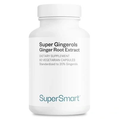 π§ͺ WHAT IS IT? Super Gingerols is an extract of ginger (Zingiber officinale) standardized to 20% gingerols which have multiple properties, delivered in vegetarian capsules. It may help for digestive problems (upset stomach following a fatty meal) and especially for acid reflux. π©ββοΈ WHAT ARE THE BENEFITS? Super Gingerols is a simple, natural and safe supplement. It is one of those basic nutritional supplements you should always have in your βfirst-aid kit'. It may help for relieving joint or muscle pain, nausea, and temporary digestive problems, as well as for maintaining long-term, optimal health. π HOW TO TAKE IT? Take 2 capules a day. π¬ CONTAIN: Extract of ginger standardized to 20% gingerols | Other ingredients: Acacia gum π Supersmart.com: Innovation and Excellence since 1992!