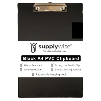 PORTABILITY: Supplywise Black A4 Clipboards are easy to carry around, making them perfect for on-the-go writing or note-taking and a retractable hanging hook for easy storage or hanging on a wall. ORGANISATION: Supplywise black clipboard a4 keeps papers secure & neatly clipped with a pen holder along one edge and rounded corners for a comfortable hold this clip folder is a practical addition to your work or home environment. STRONG METAL CLIP: High-capacity, holds up to 100 sheets of 80gsm paper, low-profile clip great for stacking. Useful for school projects & field trips, surveys & questionnaires, hospital records, memos, tickets, receipts, artwork, menus & much more EASY CLEAN: Smooth PVC surface makes the Supplywise A4 Clipboards simple to wipe down & disinfect. Reusable & Durable Clipboards A4, made of sturdy material for constant use with protective plastic corners to provide extra grip without damaging paper SUPPLYWISE: Available as Single Black Clipboards A4 & Black Folding Clipboards A4 with Cover as well as Clipboards A4 Pack of 10. Useful in Schools, Offices, Warehouses, Hospitals, and more.
