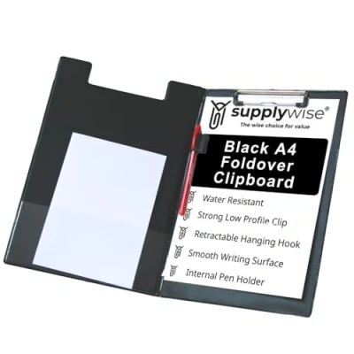 PORTABILITY: Supplywise Black A4 Clipboards are easy to carry around, making them perfect for on-the-go writing or note-taking and a retractable hanging hook for easy storage or hanging on a wall. ORGANISATION: Supplywise black clipboard a4 keeps papers secure & neatly clipped with a pen holder along one edge and rounded corners for a comfortable hold this clip folder is a practical addition to your work or home environment. STRONG METAL CLIP: High-capacity, holds up to 100 sheets of 80gsm paper, low-profile clip great for stacking. Useful for school projects & field trips, surveys & questionnaires, hospital records, memos, tickets, receipts, artwork, menus & much more EASY CLEAN: Smooth PVC surface makes the Supplywise A4 Clipboards simple to wipe down & disinfect. Reusable & Durable Clipboards A4, made of sturdy material for constant use with protective plastic corners to provide extra grip without damaging paper SUPPLYWISE: Available as Single Black Clipboards A4 & Black Folding Clipboards A4 with Cover as well as Clipboards A4 Pack of 10. Useful in Schools, Offices, Warehouses, Hospitals, and more.