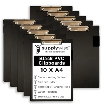 PORTABILITY: Supplywise Black A4 Clipboards are easy to carry around, making them perfect for on-the-go writing or note-taking and a retractable hanging hook for easy storage or hanging on a wall. ORGANISATION: Supplywise black clipboard a4 keeps papers secure & neatly clipped with a pen holder along one edge and rounded corners for a comfortable hold this clip folder is a practical addition to your work or home environment. STRONG METAL CLIP: High-capacity, holds up to 100 sheets of 80gsm paper, low-profile clip great for stacking. Useful for school projects & field trips, surveys & questionnaires, hospital records, memos, tickets, receipts, artwork, menus & much more EASY CLEAN: Smooth PVC surface makes the Supplywise A4 Clipboards simple to wipe down & disinfect. Reusable & Durable Clipboards A4, made of sturdy material for constant use with protective plastic corners to provide extra grip without damaging paper SUPPLYWISE: Available as Single Black Clipboards A4 & Black Folding Clipboards A4 with Cover as well as Clipboards A4 Pack of 10. Useful in Schools, Offices, Warehouses, Hospitals, and more.