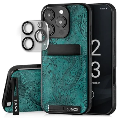 SURAZO Genuine Leather Back Case for iPhone 16 Pro Shockproof Mobile Phone with Camera Protection Glass, Card Slot, Stand Function, Keychain
