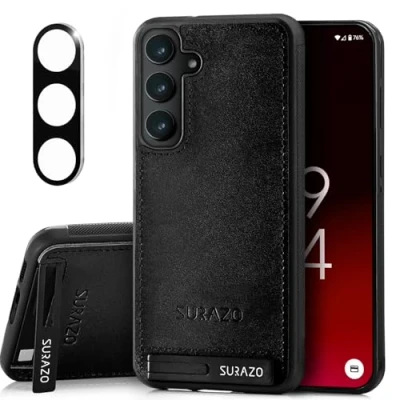SURAZO Leather Case for Samsung Galaxy S25 with Camera Protection Genuine Back Mobile Phone [Stand Function] [Key Ring] Shockproof Protective (Black)
