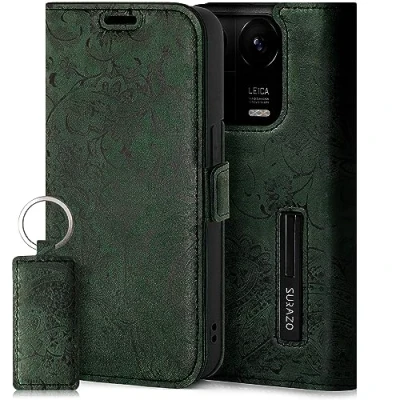 SURAZO Leather Wallet Mobile Phone Case Compatible with Xiaomi 14 Pro 5G Flip & Fold Smartphone Stand, RFID Blocker, Magnet Closure, 3 Slots for Bank Cards Handcrafted European