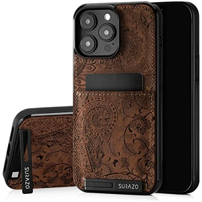 SURAZO Protective Phone Case for Apple iPhone 15 Pro Genuine Leather Cover with Card Holder Slim Back Foldable Stand and Keychain Robust Bumper Protector (Floral Brown)