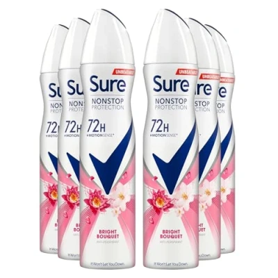 Sure Antiperspirant 72H Nonstop Sweat and Odour Protection Alcohol Free Body Spray Anti White Markswith Fresh Clean Multi Fragrance Deodorant for Women, 250ml (Bright Bouquet, Buy 6)